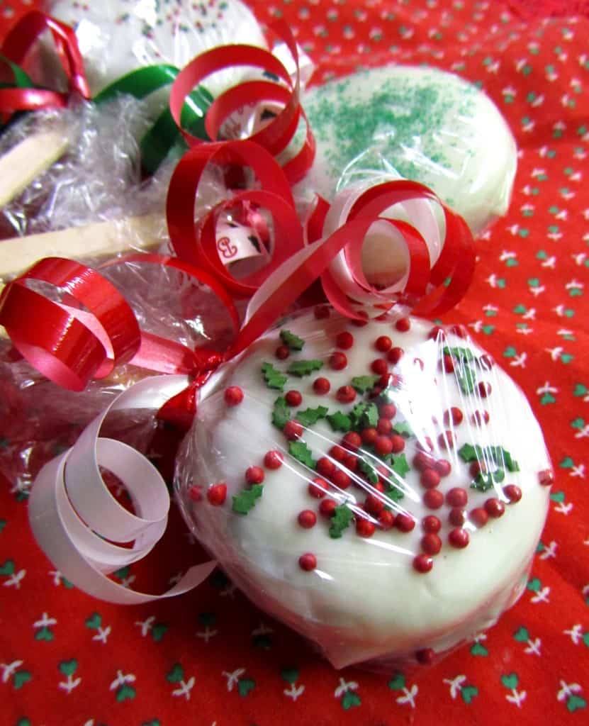Chocolate covered Oreos never disappoint. So when I saw the recipe for Brownie Covered Oreos at Picky Palate I assumed they would have the same result. Assumption correct! Just as she says the cookies are soft inside almost like little cakes. I actually prefer soft Oreos (usually meaning stale) and I don’t care if you think I’m weird! Also, I decided to cover the entire thing with chocolate, instead of just drizzling, and put it on a stick. Finished off by wrapping in plastic wrap and tying off with curled ribbon. Perfect for handing out during the holidays :-).