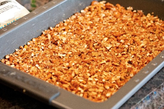 - First make the pretzel crust by combining the crushed pretzels, melted butter butter and sugar. Mix it all together until clumps form then press the mixture into a greased 9×13 pan.