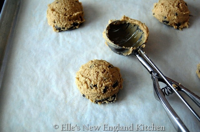 Line your baking sheets with parchment paper, and using a 1/3 cup ice cream scoop (or measuring cup), scoop out 4 cookie dough balls and give them plenty of space between each other. You might be able to squeeze 5 on to a sheet, but I’m not going to guarantee that they won’t morph into a monster cookie. Which is still tasty, but then you won’t have crispy edges to nosh on.