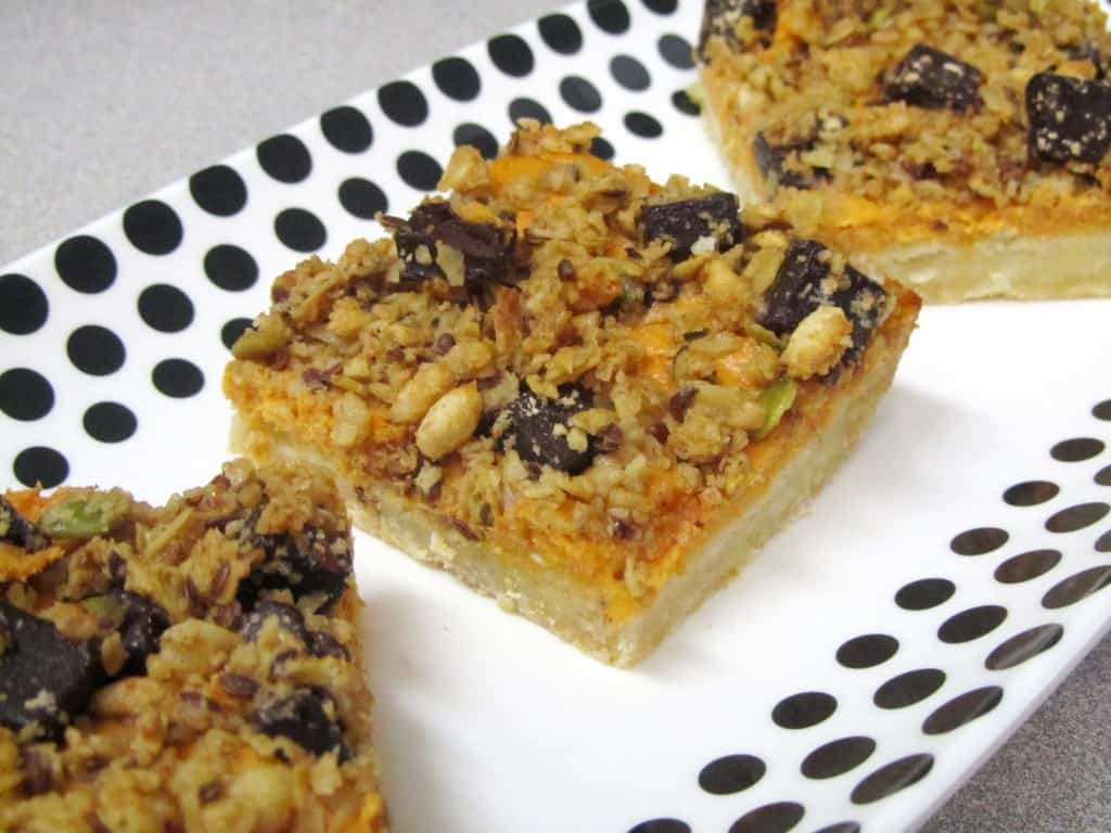 These bars could have been made with pumpkins puree, which would have been easier because all I would’ve had to do is pop open a can. But I decided to go ahead and cook up some sweet potato and dig out my food processor to make puree. Was it worth it? Definitely. These bars are like sweet potato cheesecake, with a dense-cakey (almost sugar cookie-like) crust and a granola-dark chocolate topping. I have never used granola for a topping (only oats) and really enjoyed the extra crunch it added. I used one of my favorite store-bought granolas that has pumpkin seeds in it to complete the fall-ness of these bars.