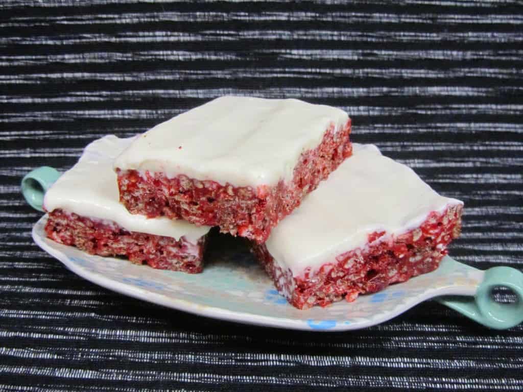 Everything you love about red velvet cake in rice krispy treat form. Perfect for a quick Valentine’s Day treat!