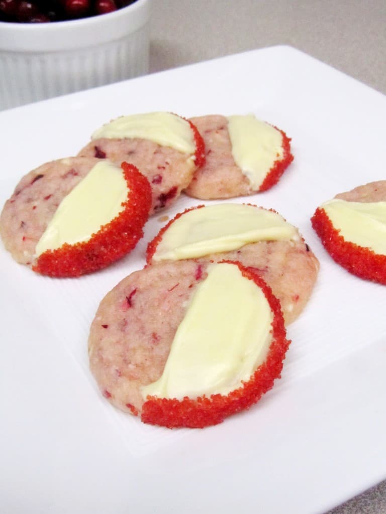 I love that these cookies use fresh cranberries, a very important distinction if you are making them because the moisture from the fresh cranberries is key to form the dough. Other than also having white chocolate, they are a very simple shortbread consisting of flour, sugar, and of course butter.