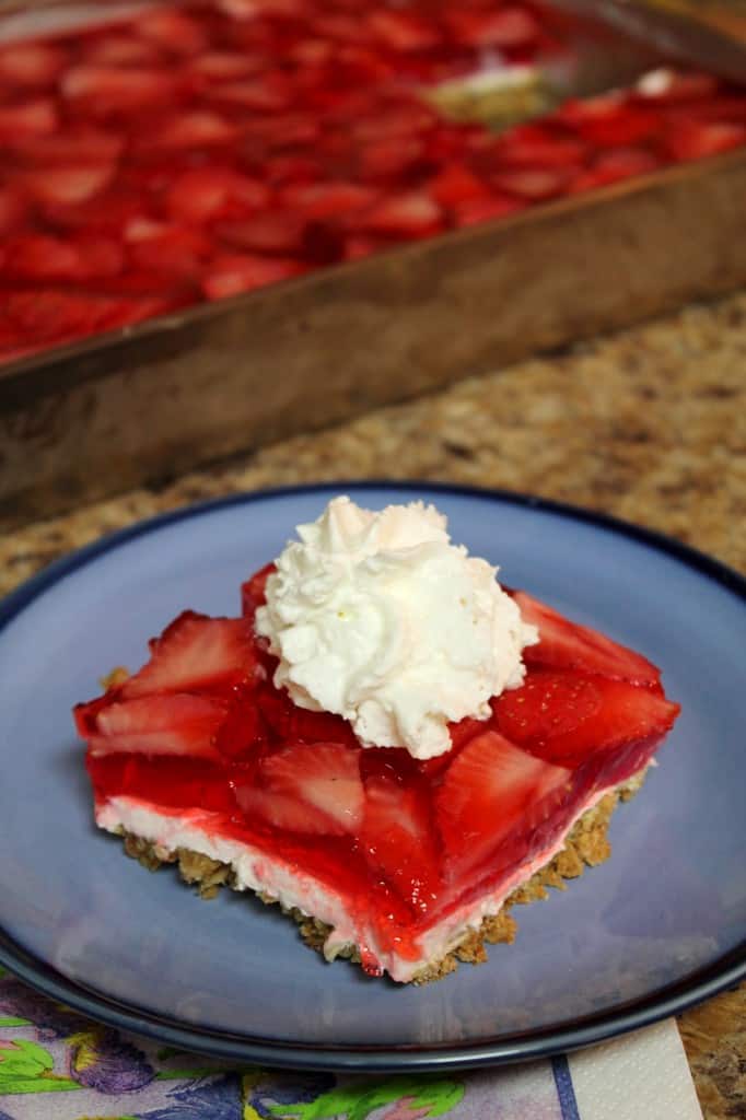 If you are unfamiliar with this treat, it consists of a pretzel crust, cream cheese filling and a strawberry gelatin topping. I actually used a new grocery store find for the filling – Greek cream cheese which is a blend of Greek yogurt and cream cheese. Talk about a brilliant idea.