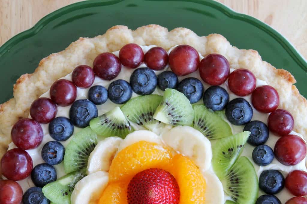 This Rainbow Fruit Pizza Tart will create spontaneous smiles with a sugar cookie crust, vanilla Greek-cream cheese filling and a rainbow of fruit.