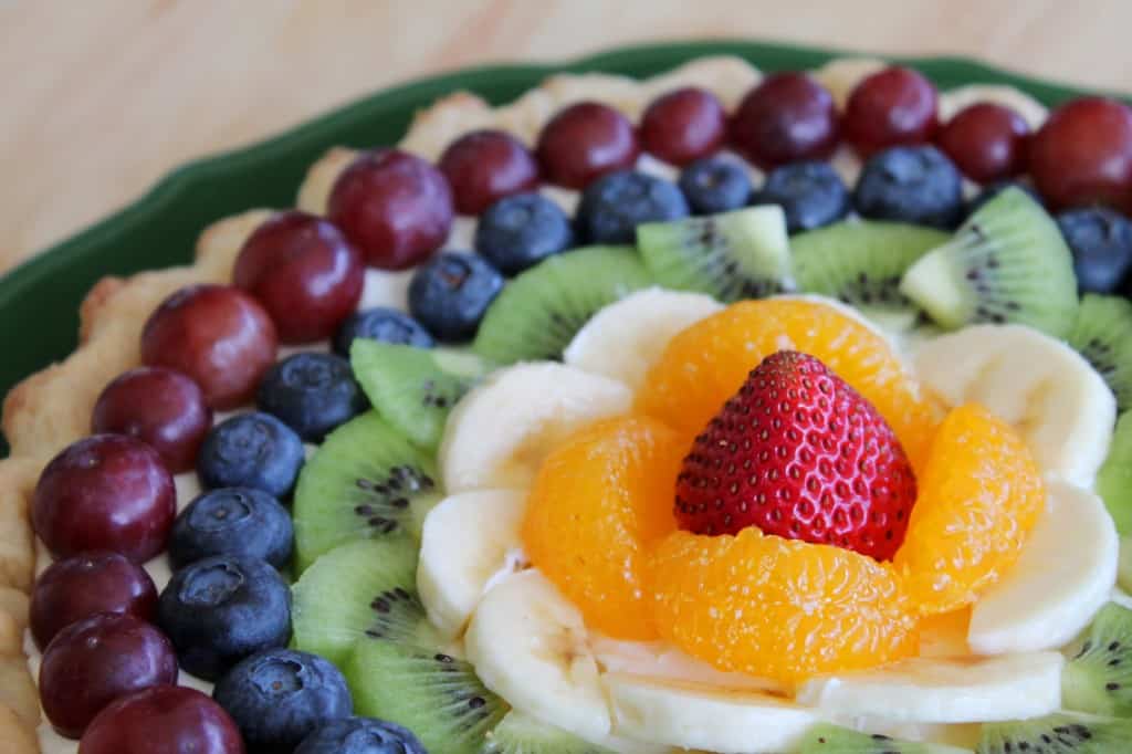 - Beginning on the outside, add rings of fruit in the order of grape, blueberry, kiwi, banana, orange, and strawberry. Refrigerate until ready to serve.
