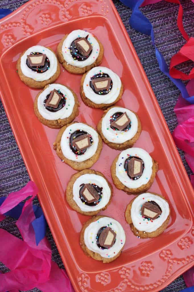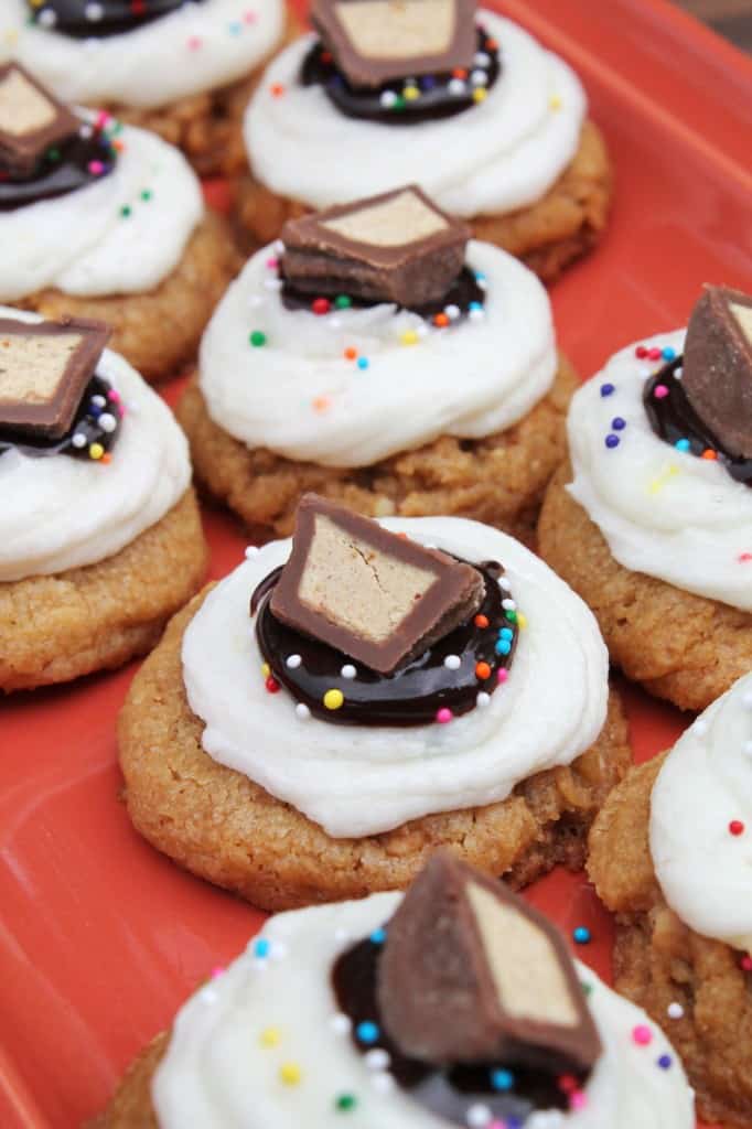 - To assemble, frost cookies (I used a large circle piping tip and used a spoon to make a little “well” to hold the ganche). Spoon in ganache, then top with sprinkles and peanut butter cup halves.