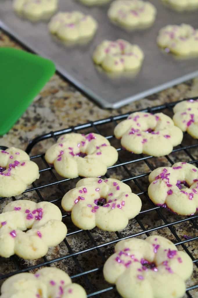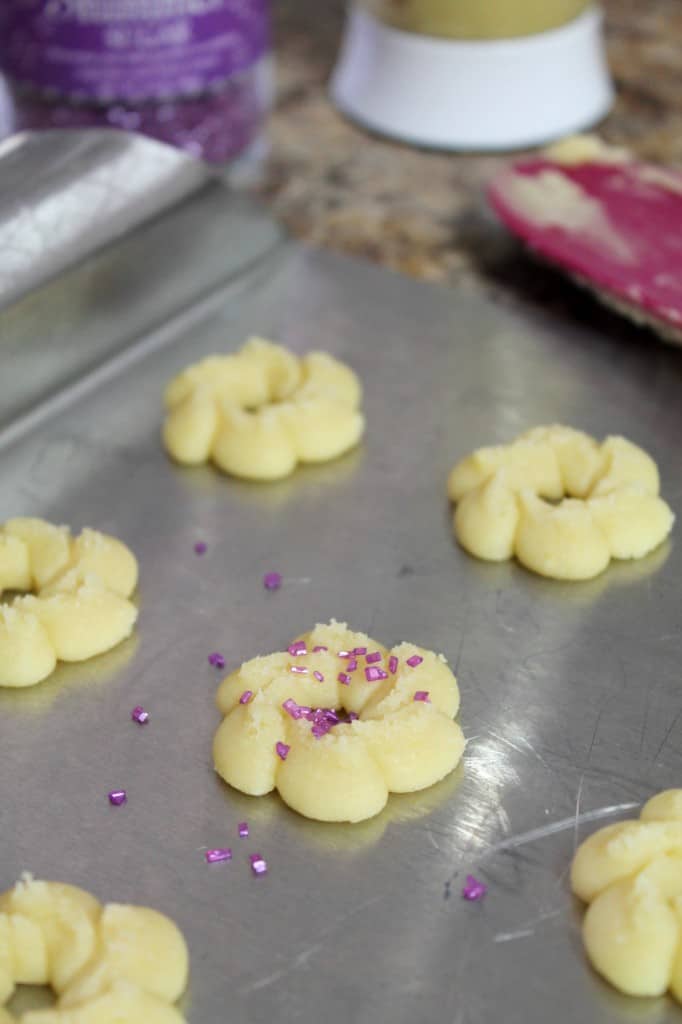 - Place dough in cookie press with desired dish. Press dough out onto an ungreased cookie sheet, 1-2 inches apart. Top with sprinkles, if using.