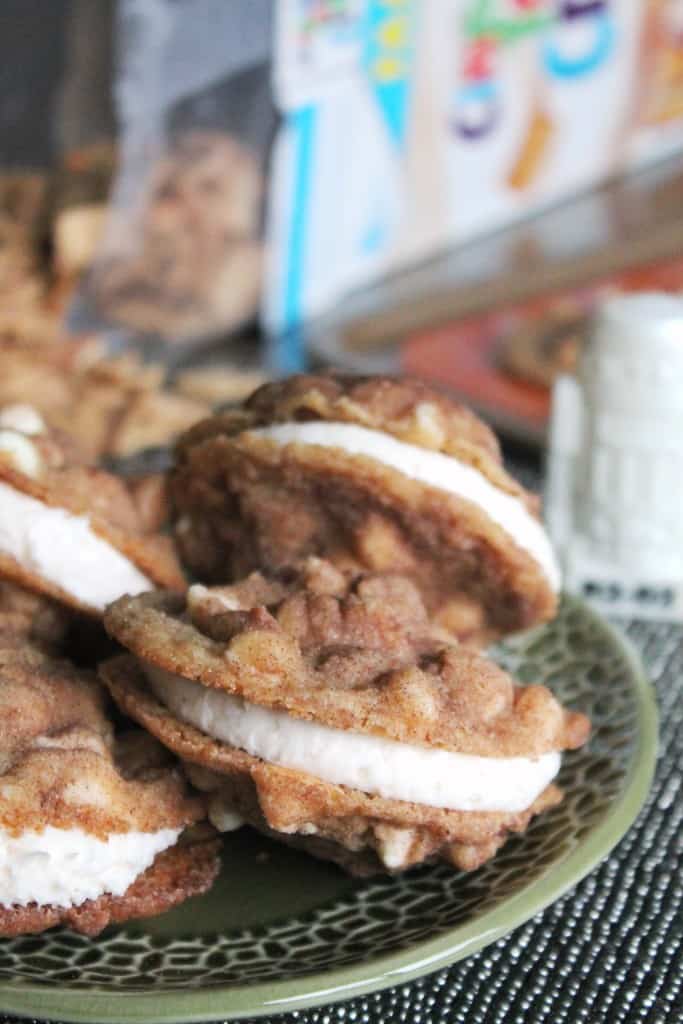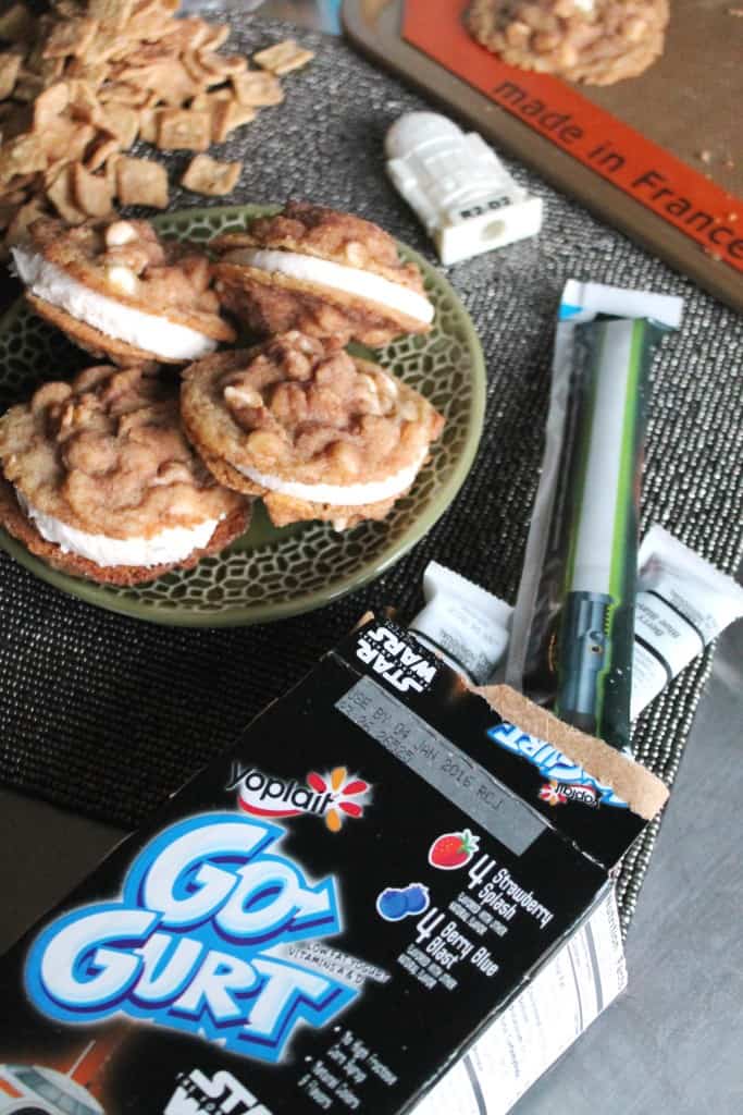 While I do enjoy filling my bowl with the breakfast of jedis, I couldn’t resist the opportunity to create a special cereal treat to celebrate the arrival of this movie. I give you, wookiee pies! These white chocolate chip cookies have Cinnamon Toast Crunch Cereal mixed in and are sandwiched with cream cheese frosting in the middle. The result resembles a whoopie pie but obviously these arn’t just any old whoopie pie, they are the best whoopie pies in the galaxy and therefore must be called wookiee pies!