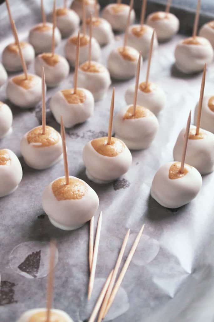Originally I had the grand plan of drawing little red lines on these to make them look like actual eyeballs in the spirit of Halloween. But I decided I didn’t have time to do that to every single one soooo here we are with regular white chocolate buckeyes! Maybe next year ;-). These are exactly the same as the buckeyes candies I posted long ago, but they are dipped in white chocolate instead. Mind blowing I know.