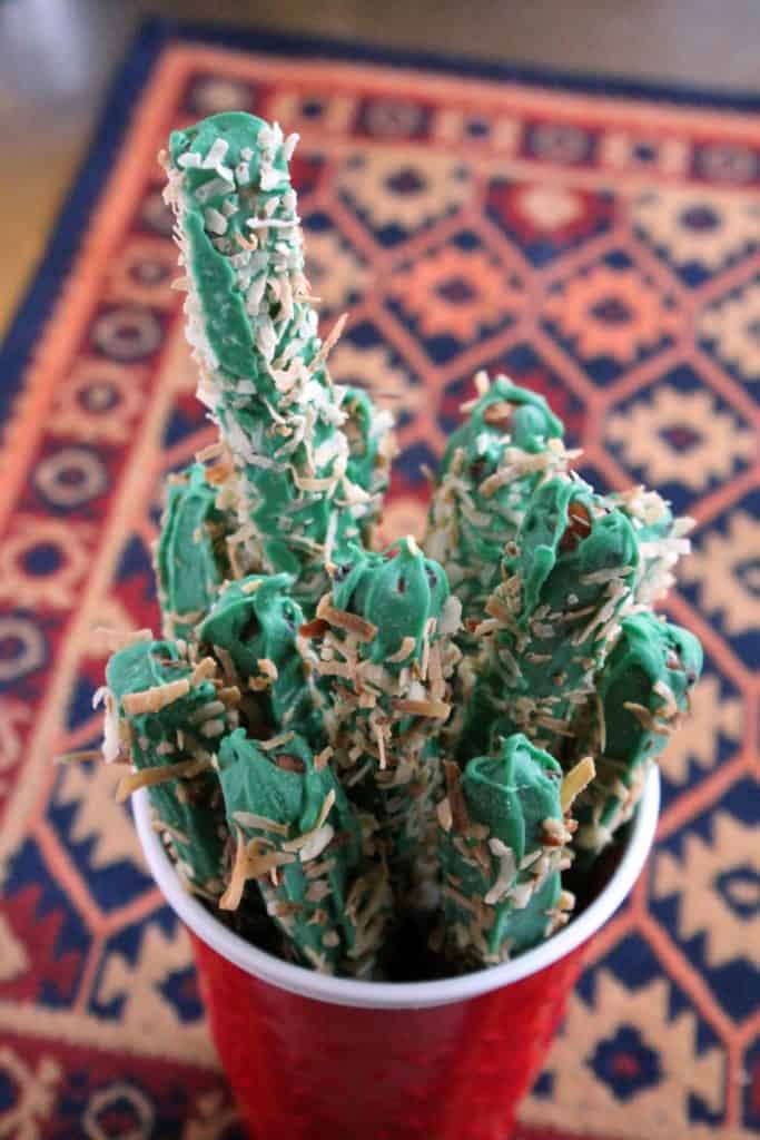The third movie is when Marty goes back to the Western times of 1885. So I came up with a menu inspired by such: taco train (taco bar with a cardboard train engine made by Bob followed by aluminum “cars” filled with toppings, all on paper train tracks made by Haley) with carnitas and homemade salsa, cactus pretzels (green chocolate covered with toasted coconut), guacamole cheese ball (recipe to be shared closed to Cinco de Mayo), these cookies, and a margarita that I will be sharing on Thursday for National Margarita Day!