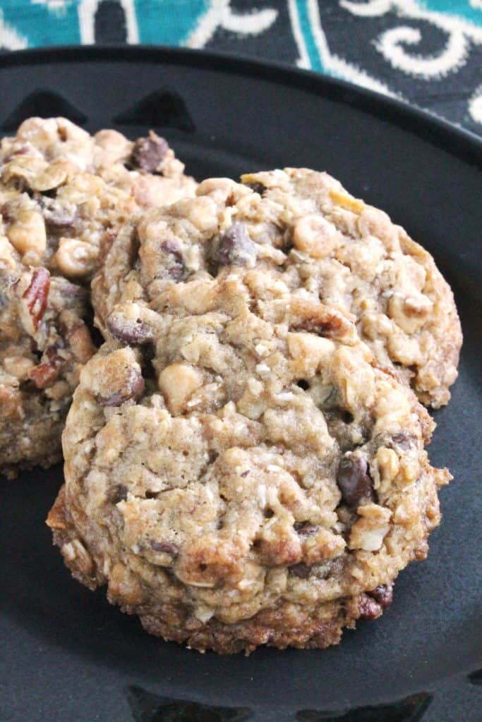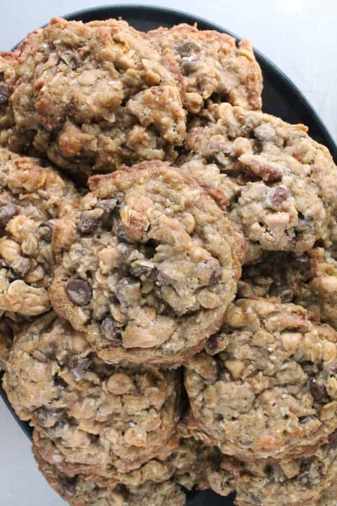 These cookies are fit for a Texas cowboy – they are huge! And they are packed with tons of mix-ins including chocolate chips, peanut butter chips, pecans, corn flakes, and coconut flakes!