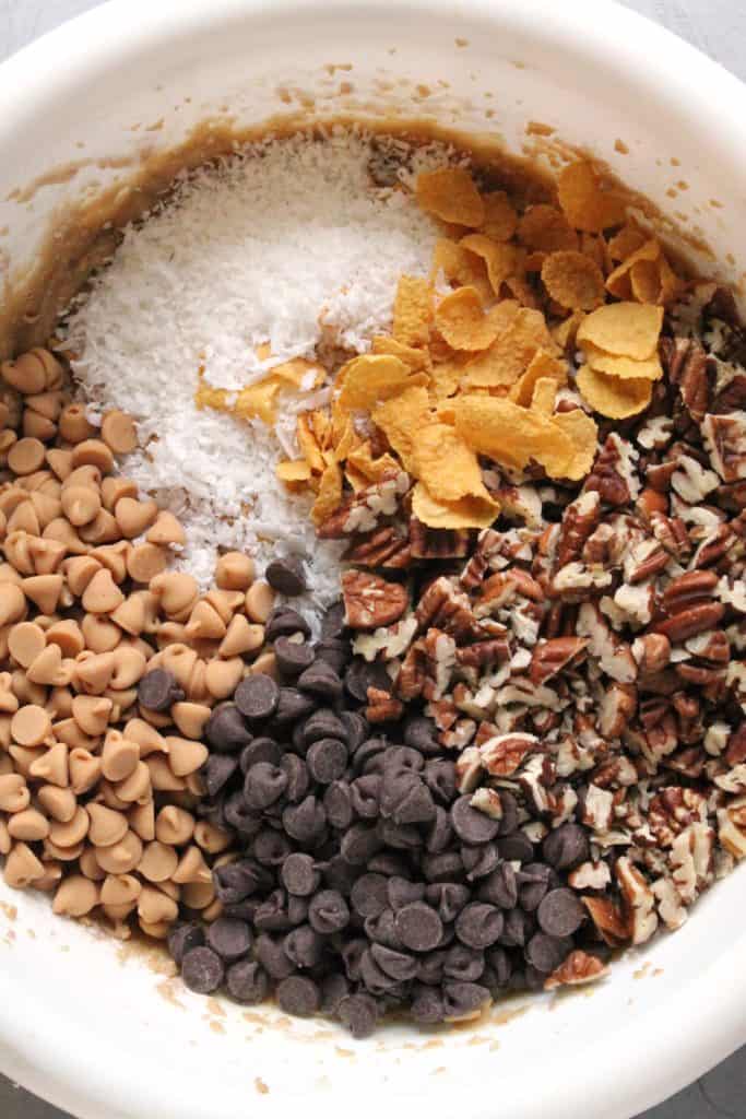 - In a medium bowl, cream together the melted butter, brown sugar and white sugar until well blended (1-2 minutes). Beat in the vanilla, egg, and egg yolk until light and creamy. Mix in the sifted ingredients in three batches until just blended. Fold in the chips, pecans, corn flakes, and coconut by hand.