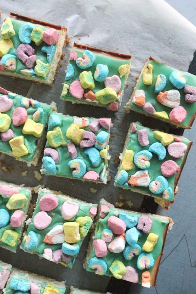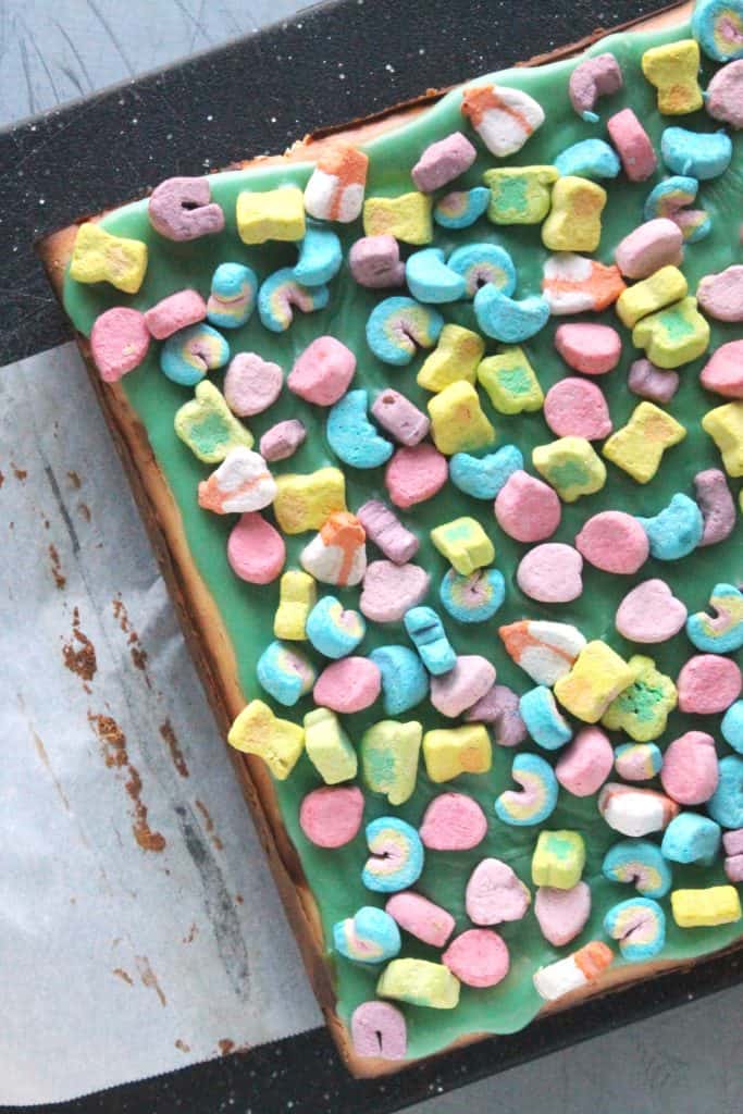 I love cheesecake bars because they cook faster than a regular cheesecake and they require less tricks to prevent cracking. Of course even if I had made a regular cheesecake that vibrant green ganache would’ve covered it right up. Not to mention the marshmallows on top. But what I’m getting at is that you really need to make these because they are deliciously perfect for St. Patrick’s Day. I also recommend lucky charms sugar cookies or lucky lemon pie!