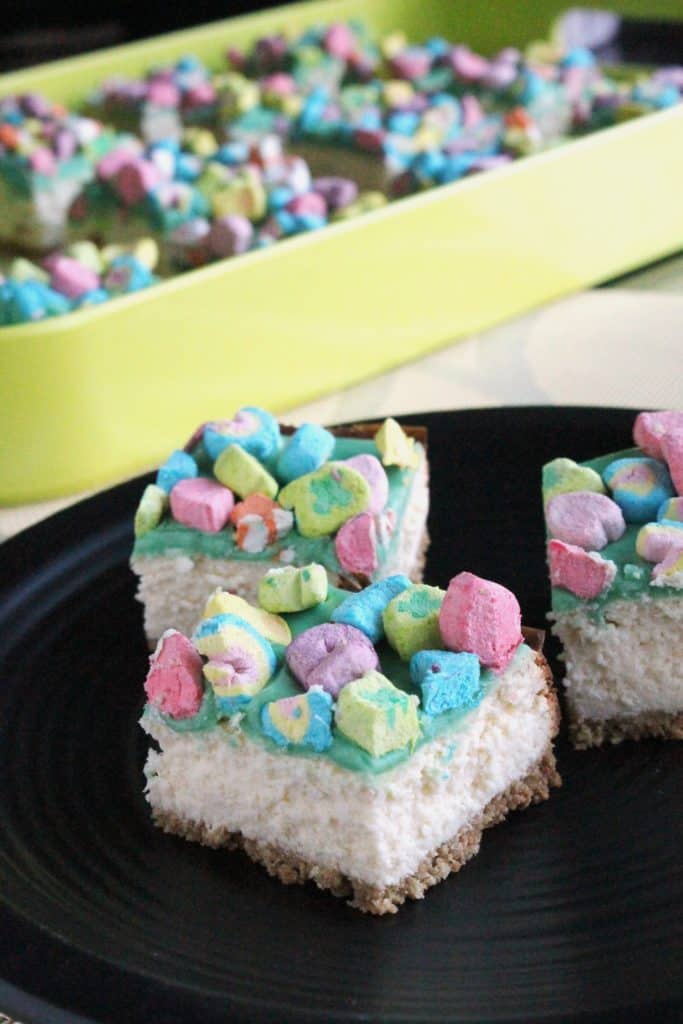 Feel lucky this St. Patrick’s day with these white chocolate cheesecake bars with a Lucky Charms crust and topping.