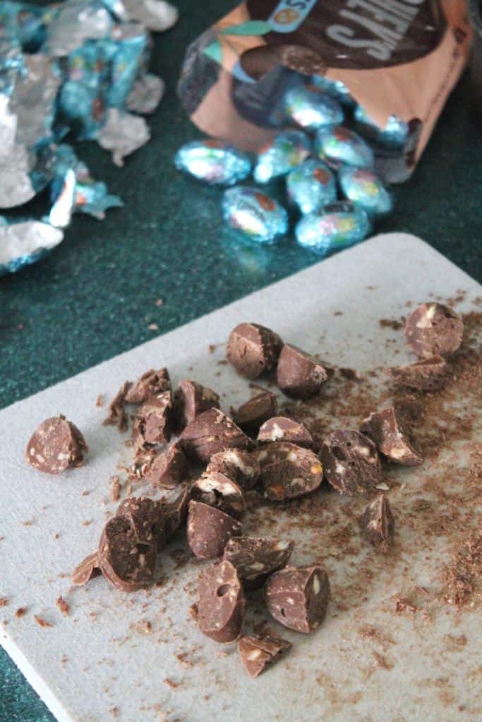 1 (10 oz.) bag chopped Hershey’s pretzel eggs (or 2 cups total chopped chocolate and pretzels)