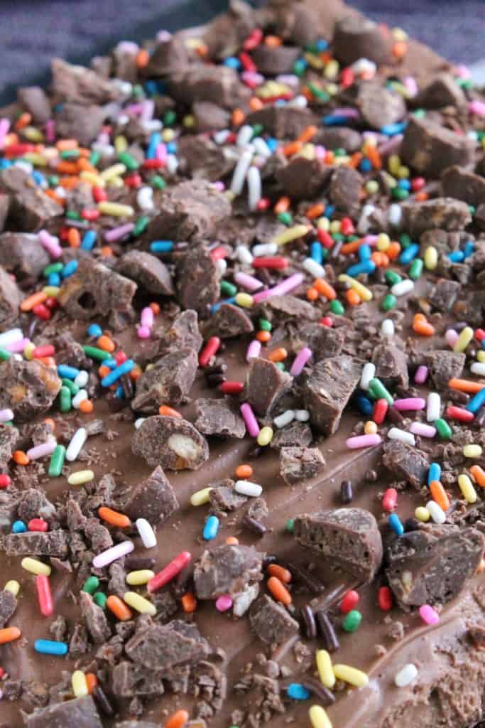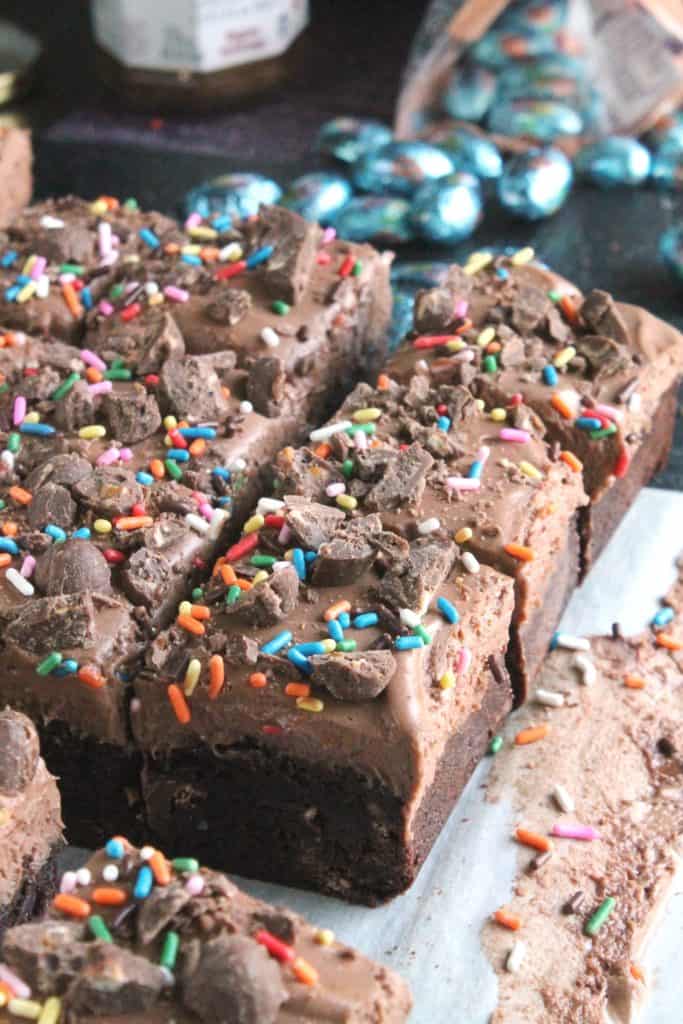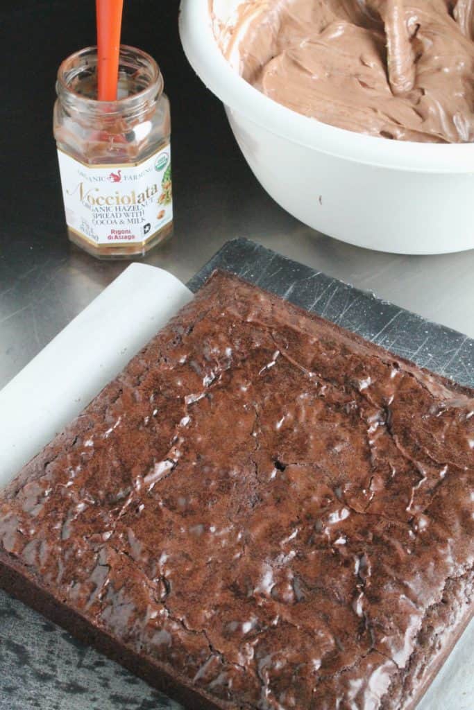 - Using a rubber spatula, spread the chocolate hazelnut mousse on top of the cooled brownies and refrigerate for an hour, or until ready to serve. Top with sprinkles!