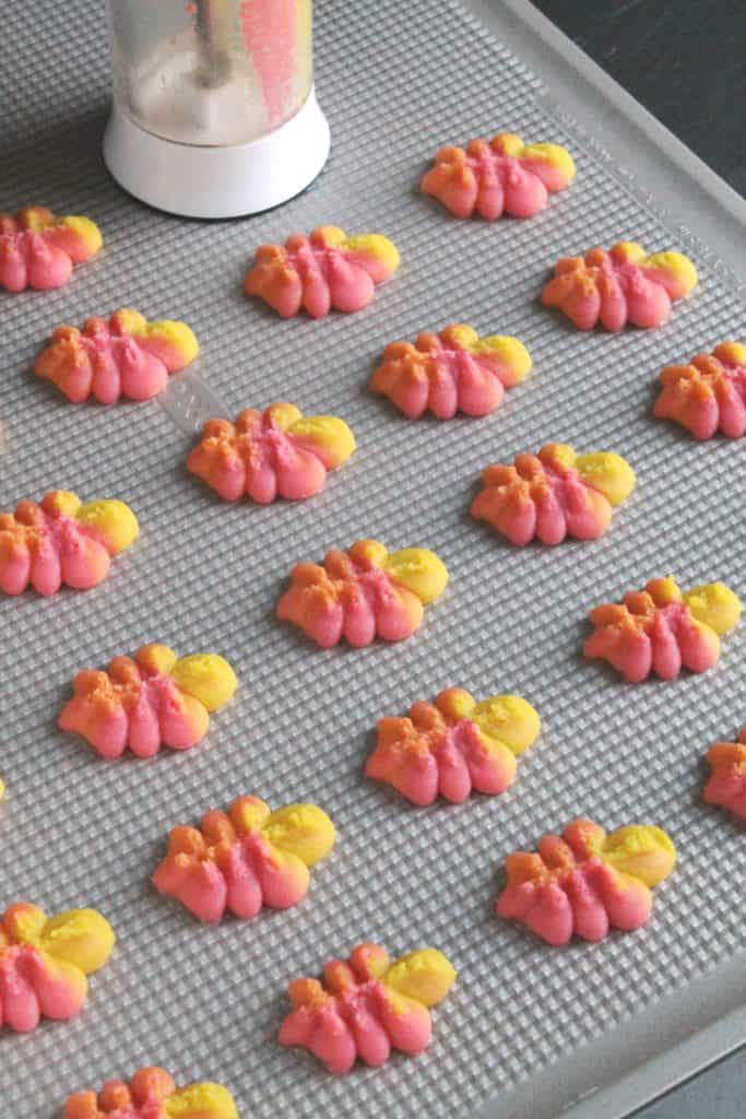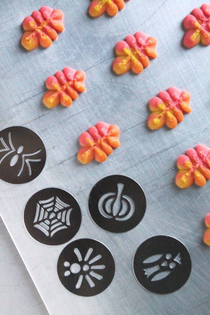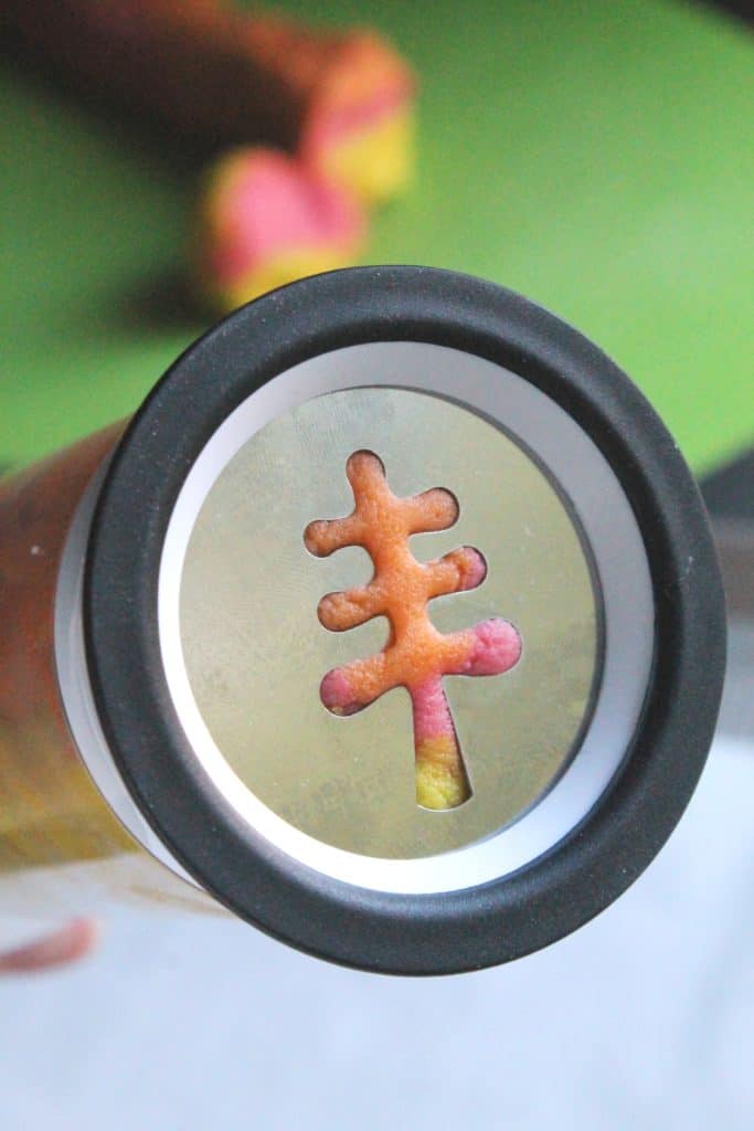 Who else gets nostalgic when that old school cookie press gets dug out from the back of the pantry? These retro cookies get a new look with autumn shapes and colors to resemble fall leaves.