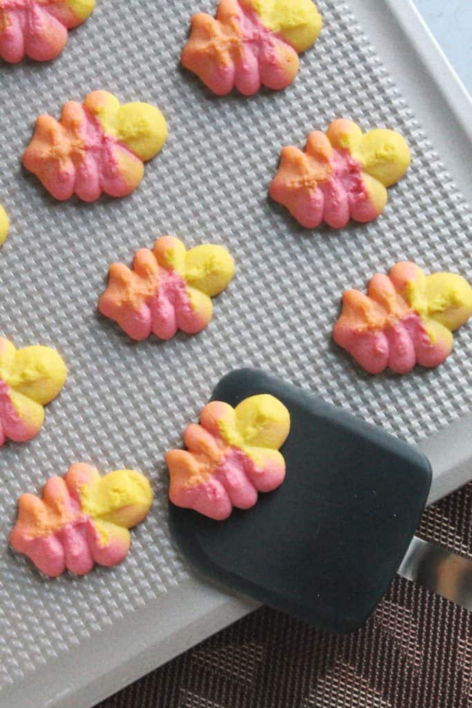 Originally, when I started I had a sheet of parchment paper on the cookie sheet but the dough wouldn’t stick to the paper – rookie mistake. Clearly a non-stick cookie sheet does not need to be covered with parchment paper, especially when dealing with press cookies which function by adhering slightly to the pan. But never fear they come off easy peasy, especially with a handy cookie spatula. I might have acquired more than one over the years and have bought several more as presents.