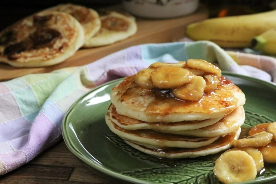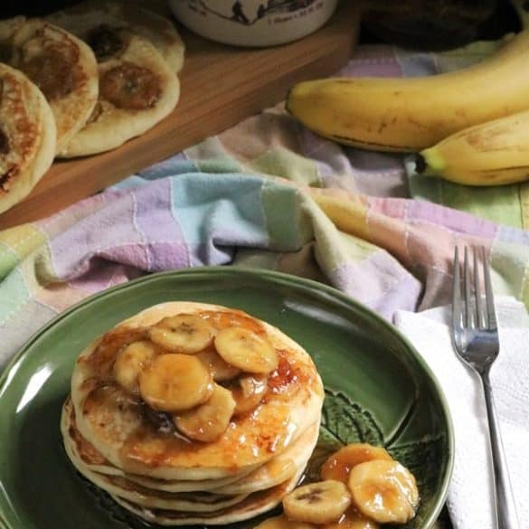 These bananas foster pancakes are a deliciously decadent way to start the day. With bananas cooked into the pancakes themselves and even more on top.