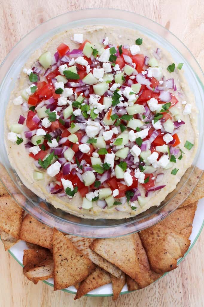If you want to go the extra mile, you could top this with briami (traditional Greek roasted veggies). But on the flip side if you are looking for less effort, instead of making homemade pita chips feel free to skip and serve with store-bought pita chips, tortillas chips or fresh vegetables.