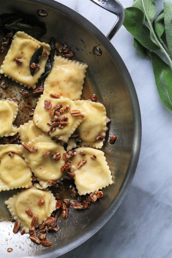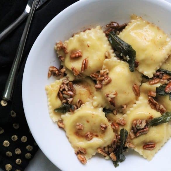 Pumpkin Goat Cheese Ravioli with Pecan and Sage Brown Butter Sauce #thespiffycookie